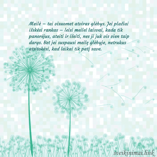 Meilė – tai visuomet atviras glėbys. Jei plačiai išskėsi rankas – leisi meilei laisvai, kada tik panorėjus, ateiti ir išeiti, nes ji juk vis vien taip darys. Bet jei suspausi meilę glėbyje, netrukus atsitokėsi, kad laikai tik patį save.